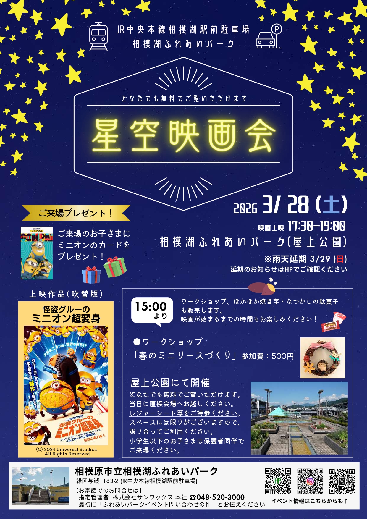3月28日の土曜日は、相模湖ふれあいパーク(屋上公園)にて第1回目となる『星空映画会(無料)』を開催いたします。